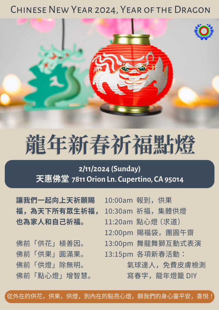 最新消息, 活動訊息 美國天惠佛堂 龍年新春祈福點燈 Date: December 30, 2023Author: wuk519 0 Comments Share this: Share on X (Opens in new window) X Share on Facebook (Opens in new window) Facebook Like Loading... Related